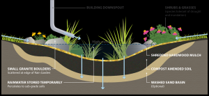 - Creating “Runoff Rain Gardens” that collect the water from hard surfaces (i.e., paved driveways) and use it to passively water themselves